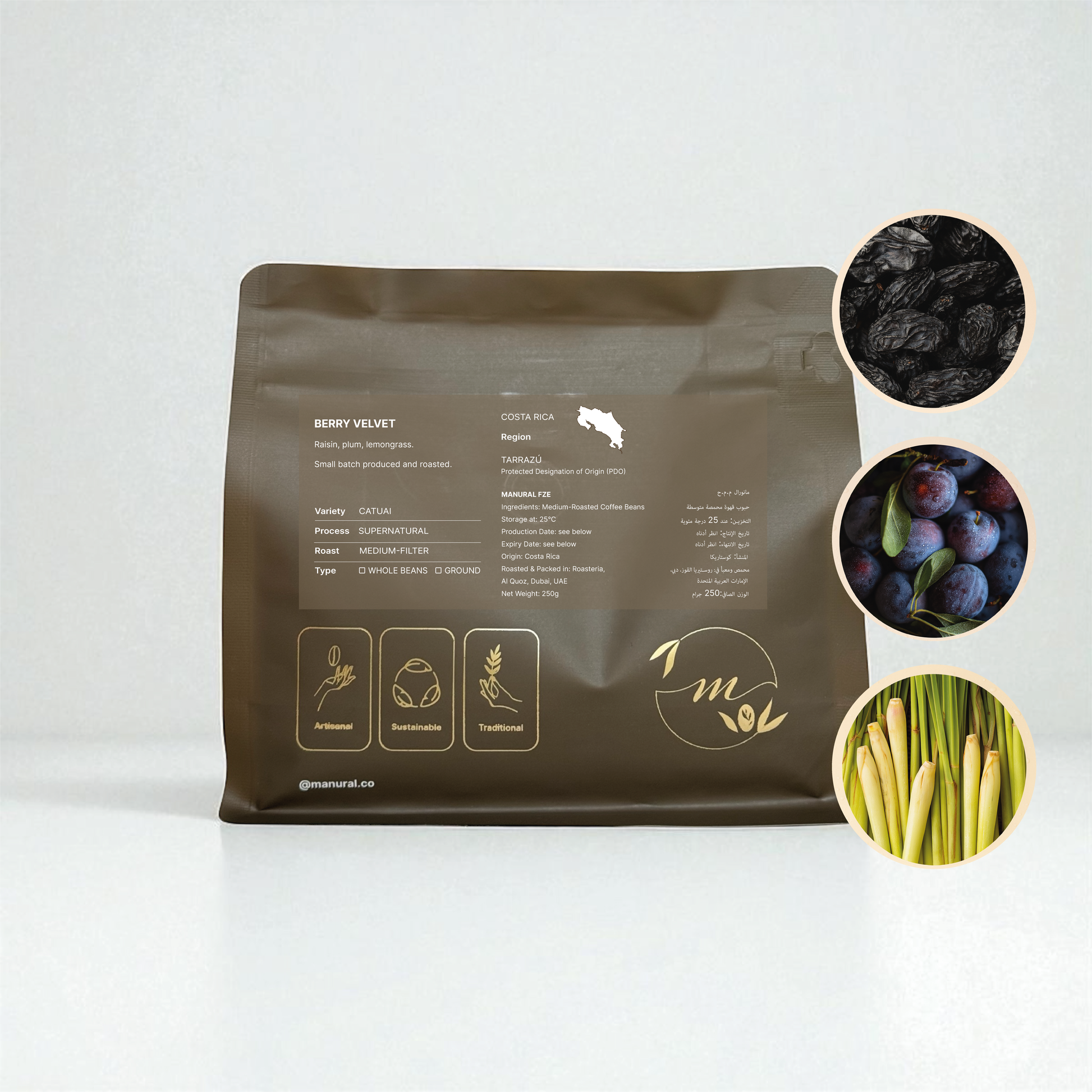 A sun-dried Supernatural process gives you a pleasant citric acidity with winey tasting notes of raisin, filling in with plum and hints of lemongrass for a velvety mouthfeel.