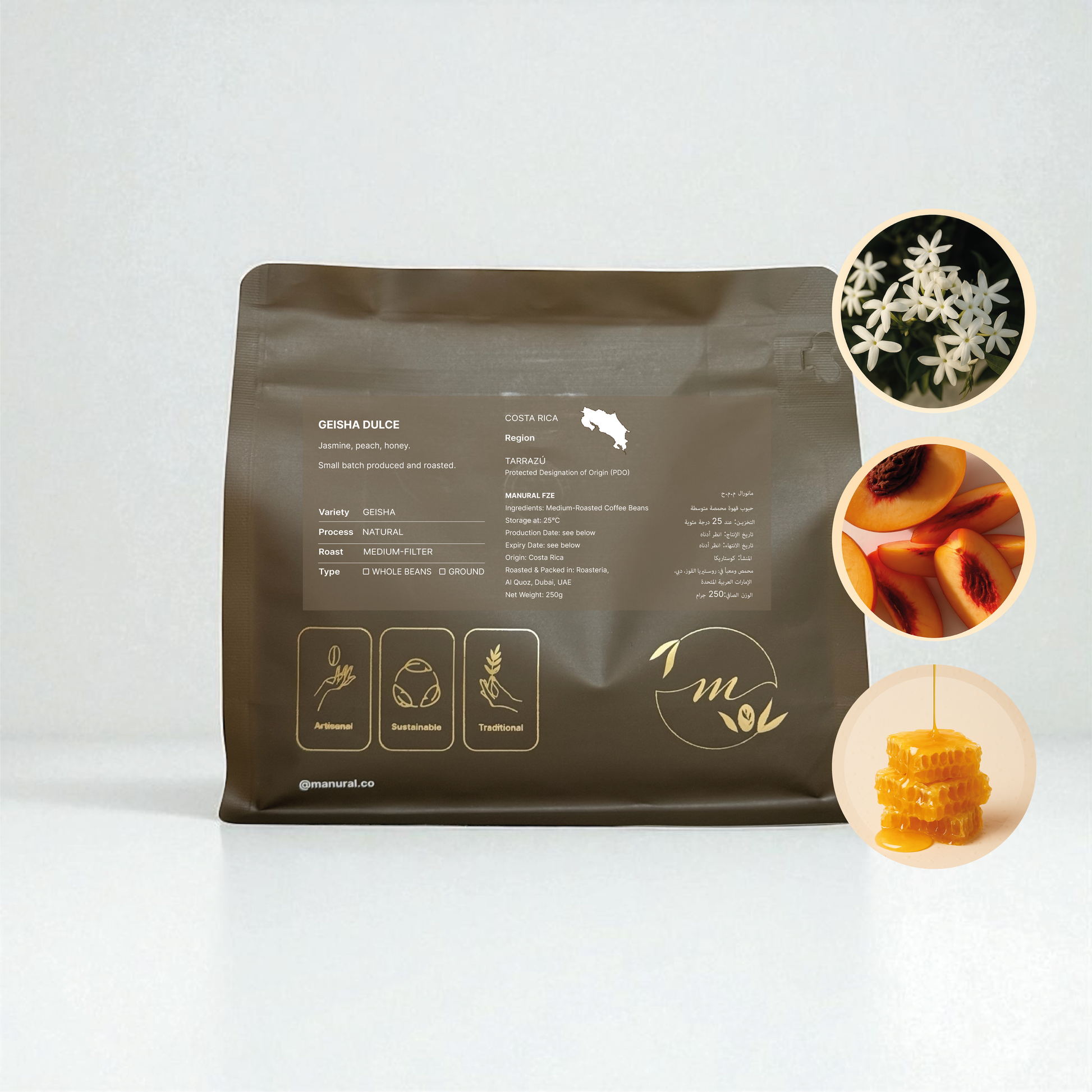 Enjoy the floral touch of jasmine, the juicy pop of peach, and the deep sweetness of honey. A silky cup that leaves a soft and lasting finish.
