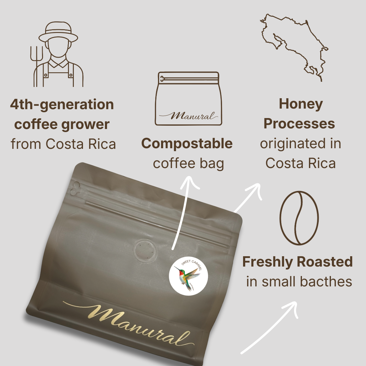 A Black Honey process where citric acidity sparks your taste and notes of toasted caramel and cocoa fill your palate. Jasmine adds a harmonious touch.
